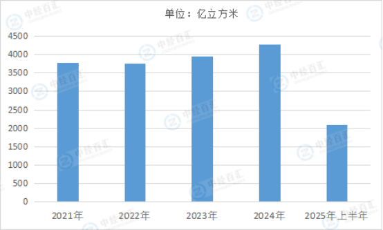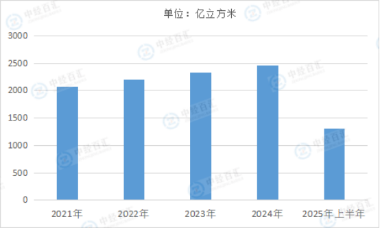 图表:2021-2025年上半年中国天然气产量情况