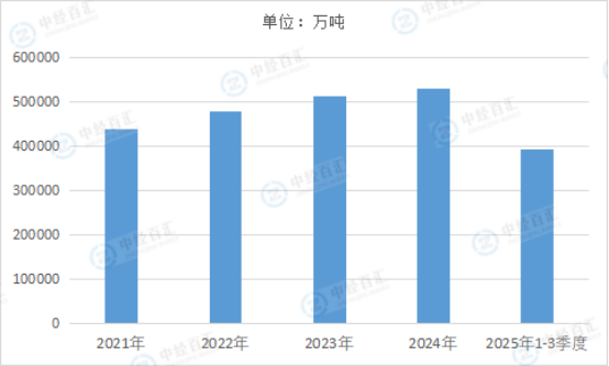 图表:2021-2025年1-3季度中国原煤表观消费量情况
