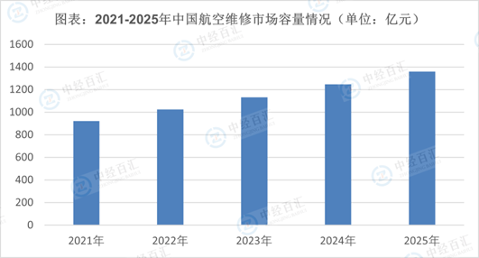 航空维修行业是资本密集型的行业,航空维修具有极强的专业性质,受到各国民航管理部门监管,采取较为严格的许可证管理制度。随着中国航空运输业的发展,本着专业化分工,以提高效益为目的,中国航空维修企业正在逐步从航空公司分离。同时航空维修企业与航空公司合作、合资,日趋常态。这种责权利高度统一,与航空公司之间天然的战略合作伙伴关系将推动中国航空维修行业的飞速发展。中小航空维修企业也根据自身优势和特点谋求在快速发展的航空维修市场占有份额,目前国内有100余家中小航空维修企业利用航空维修人员经验丰富,专业技能突出,突出精品维修项目用在航空维修质量,维修周期市场营销和售后服务等明显优势的拳头产品带动整个企业的维修服务。个别优秀企业还积极与通用航空企业合作、国际航空物流公司合作,争取获得授权并开展航材交换维修等的良好竞争手段。正是国内大中小航空维修企业共生构造了中国航空维修产业板块。2025年航空维修行业市场容量约1359.42亿元,航空维修行业保持稳定增长。