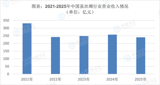茧丝绸是指用蚕丝织造的纺织品。丝绸生产常用的原料可分为蚕丝(或茧丝)、合成纤维、人造纤维等多个类别,其中蚕丝原料优点突出(如透气性强、天然等)、价格昂贵,因此业内习惯依据茧丝的种类划分茧丝绸产品。随着国内经济稳定增长,居民收入水平不断提高,丝绸国内消费已经逐步取代出口成为中国丝绸的主要市场。茧丝绸行业随着国内消费升级,不断加强品种、品质和品牌建设,借助“互联网+”带来的销售渠道扩大机会,不断创新流通和销售模式。随着科技成果不断实现产业化,更多技术应用于茧丝绸产业,产品质量逐渐提升,部分丝绸企也的实体店销售规模也增长迅速。2025年,茧丝绸行业营业收入约240.25亿元。需求端呈现内外双弱格局,国内超过半数企业面临内需不足问题,传统中低端产品需求持续萎缩,高端消费增长未能抵消整体疲软态势;海外市场受国际贸易环境不确定性、欧美碳关税壁垒及东南亚同类产能挤压影响,外销订单大幅下滑,进一步拖累营收增长。