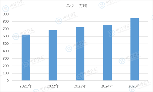 图表:2021-2025年中国玻璃纤维行业产量情况