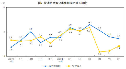 按消费类型分,8月份,商品零售额35172亿元,同比增长3.6%;餐饮收入4496亿元,增长2.1%。1—8月份,商品零售额287426亿元,增长4.8%;餐饮收入36480亿元,增长3.6%。