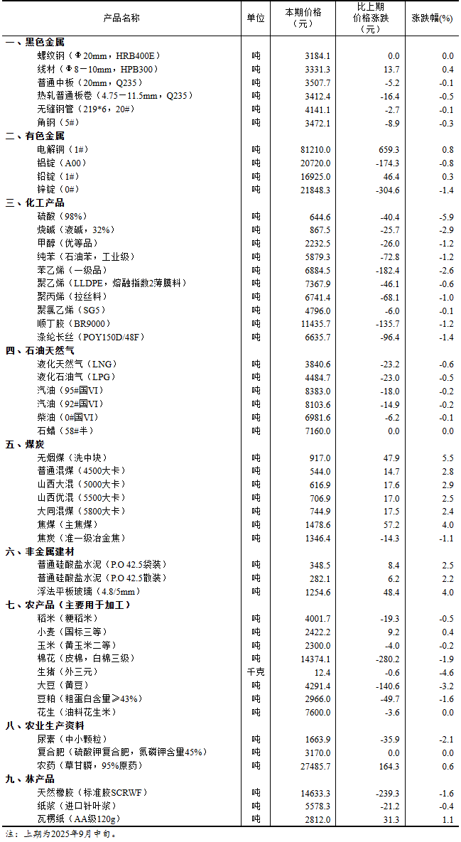 图表:2025年9月下旬流通领域重要生产资料市场价格变动情况