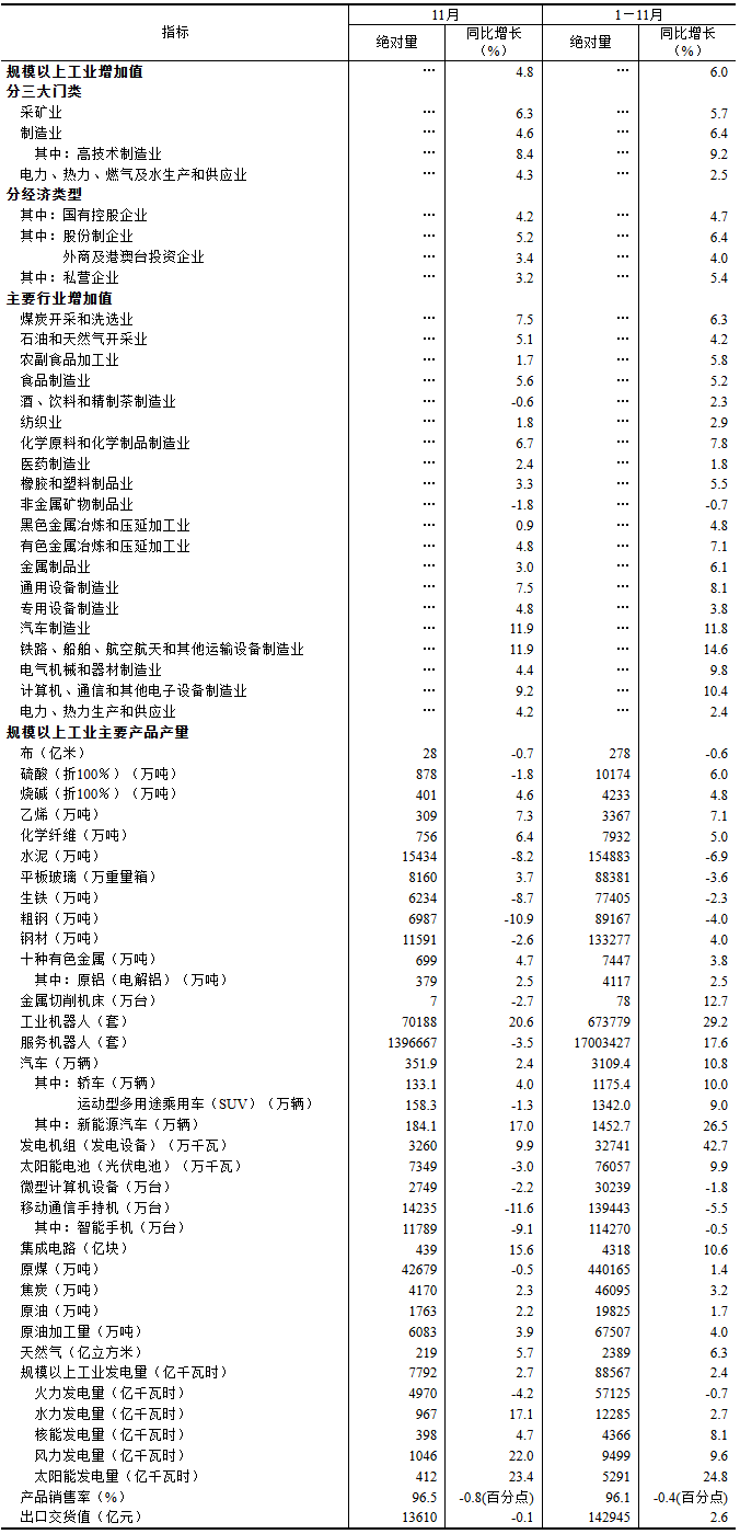11月份,规模以上工业增加值同比实际增长4.8%(增加值增速均为扣除价格因素的实际增长率)。从环比看,11月份,规模以上工业增加值比上月增长0.44%。1—11月份,规模以上工业增加值同比增长6.0%。