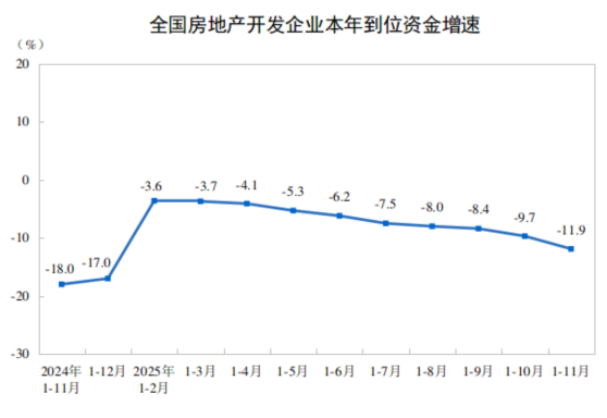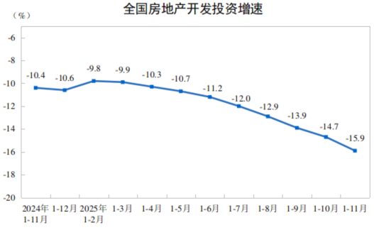1—11月份,全国房地产开发投资78591亿元,同比下降15.9%;其中,住宅投资60432亿元,下降15.0%。