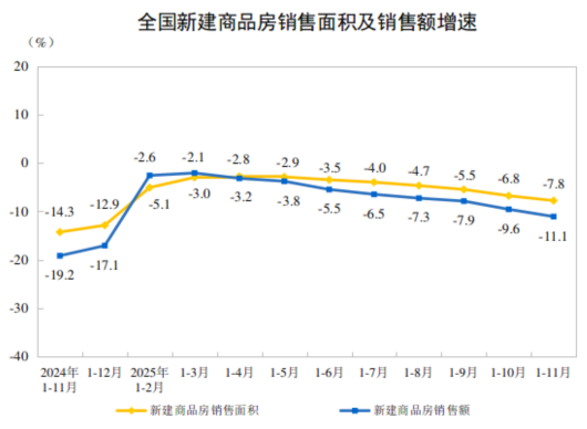 1—11月份,新建商品房销售面积78702万平方米,同比下降7.8%;其中住宅销售面积下降8.1%。新建商品房销售额75130亿元,下降11.1%;其中住宅销售额下降11.2%。