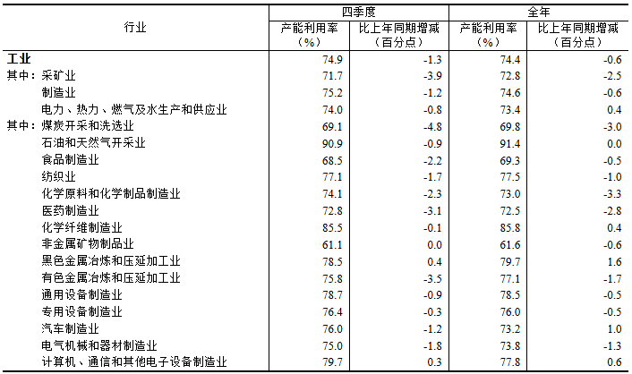 分主要行业看,2025年四季度,煤炭开采和洗选业产能利用率为69.1%,食品制造业为68.5%,纺织业为77.1%,化学原料和化学制品制造业为74.1%,非金属矿物制品业为61.1%,黑色金属冶炼和压延加工业为78.5%,有色金属冶炼和压延加工业为75.8%,通用设备制造业为78.7%,专用设备制造业为76.4%,汽车制造业为76.0%,电气机械和器材制造业为75.0%,计算机、通信和其他电子设备制造业为79.7%。
