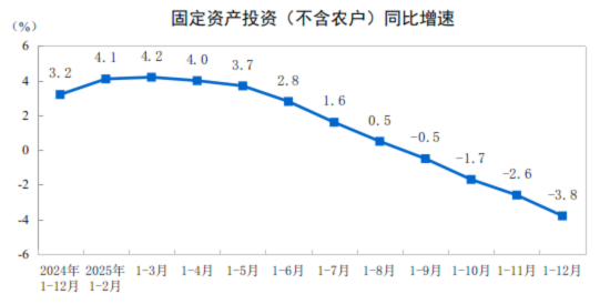 2025年,全国固定资产投资(不含农户)485186亿元,比上年下降3.8%。其中,民间固定资产投资比上年下降6.4%。从环比看,12月份固定资产投资(不含农户)下降1.13%。