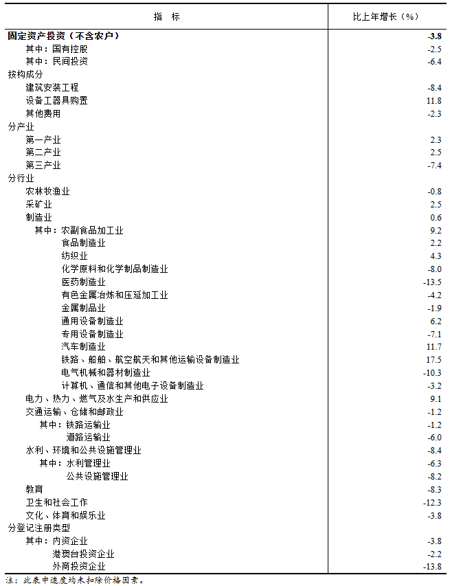 分登记注册类型看,内资企业固定资产投资比上年下降3.8%,港澳台企业固定资产投资下降2.2%,外商企业固定资产投资下降13.8%。