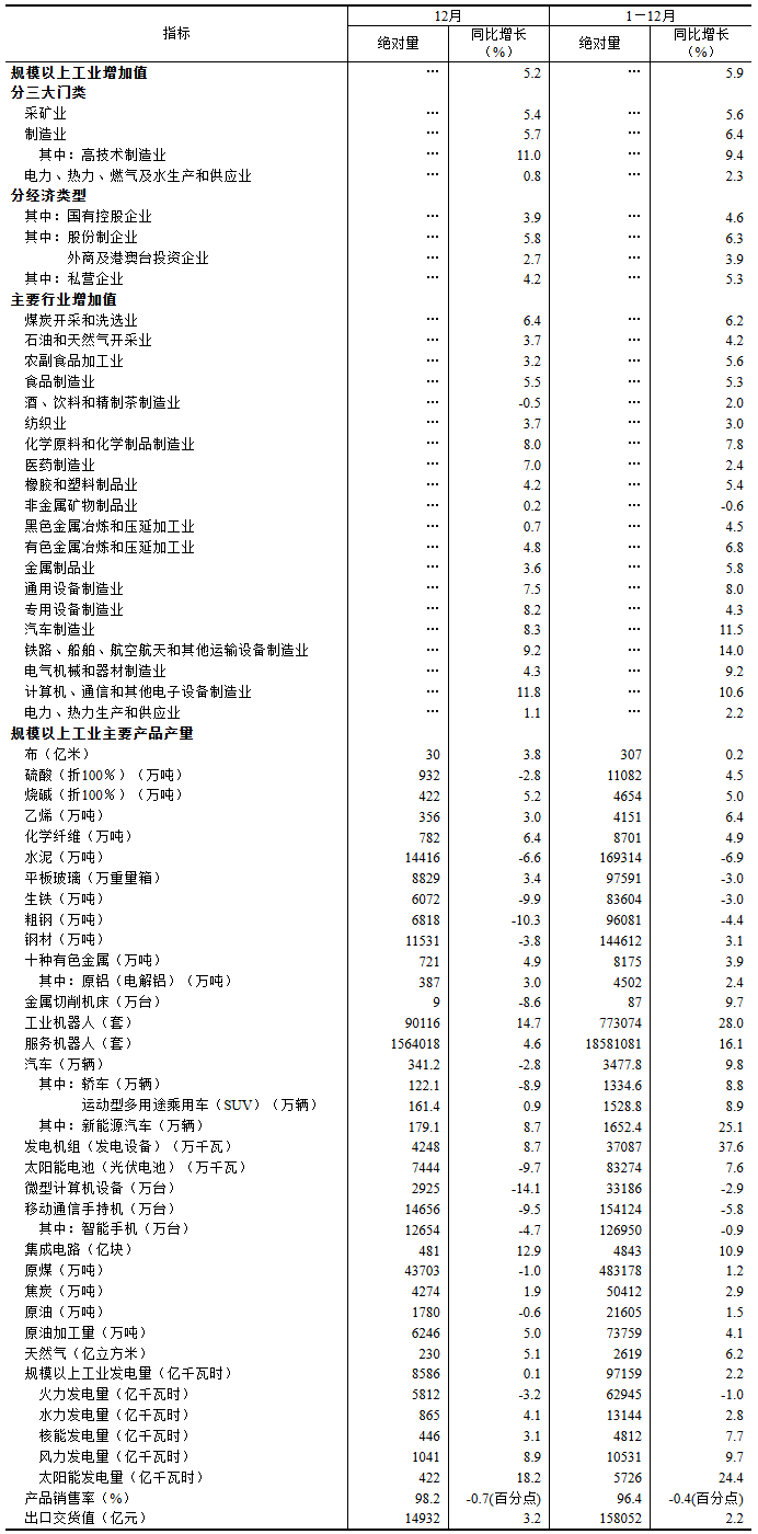 分产品看,12月份,规模以上工业623种产品中有325种产品产量同比增长。其中,钢材11531万吨,同比下降3.8%;水泥14416万吨,下降6.6%;十种有色金属721万吨,增长4.9%;乙烯356万吨,增长3.0%;汽车341.2万辆,下降2.8%,其中新能源汽车179.1万辆,增长8.7%;发电量8586亿千瓦时,增长0.1%;原油加工量6246万吨,增长5.0%。