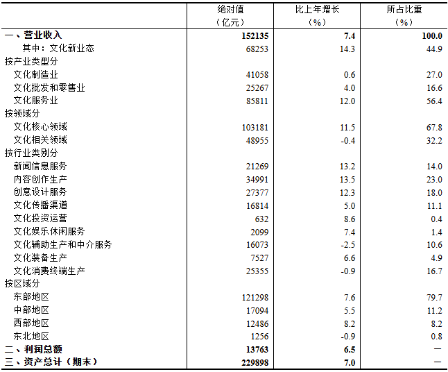 分产业类型看,文化制造业实现营业收入41058亿元,比上年增长0.6%;文化批发和零售业25267亿元,增长4.0%;文化服务业85811亿元,增长12.0%。