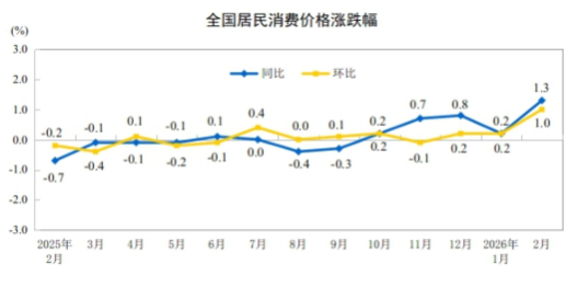 2026年2月份,全国居民消费价格同比上涨1.3%。其中,城市上涨1.4%,农村上涨0.9%;食品价格上涨1.7%,非食品价格上涨1.3%;消费品价格上涨1.1%,服务价格上涨1.6%。1—2月平均,全国居民消费价格比上年同期上涨0.8%。