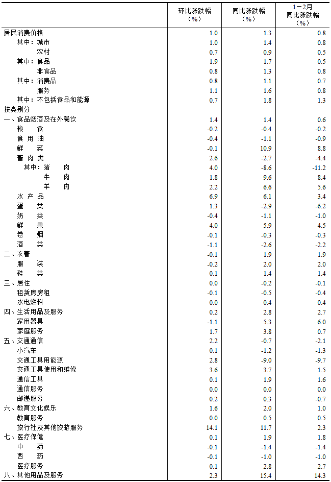 2月份,全国居民消费价格环比上涨1.0%。其中,城市上涨1.0%,农村上涨0.7%;食品价格上涨1.9%,非食品价格上涨0.8%;消费品价格上涨0.8%,服务价格上涨1.1%。