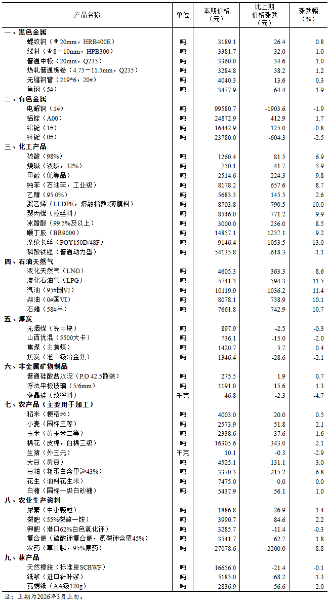 图表:2026年3月中旬流通领域重要生产资料市场价格变动情况