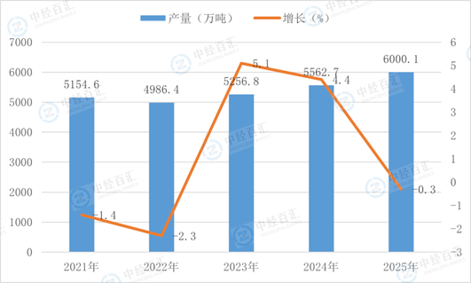 根据国家统计局数据显示,2025年,原盐产量6000.1万吨,同比下降0.3%。