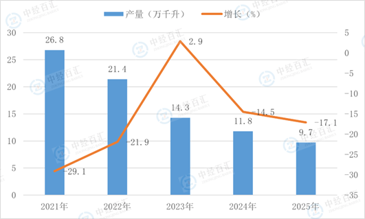 根据国家统计局数据显示,2025年,葡萄酒产量9.7万千升,同比增长-17.1%。