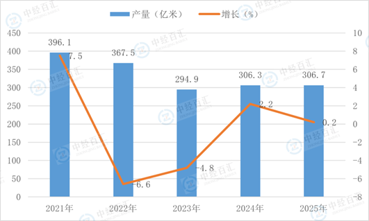 根据国家统计局数据显示,2025年,布产量306.7亿米,同比增长0.2%。