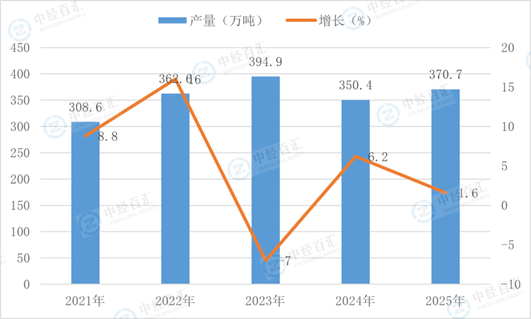 根据国家统计局数据显示,2025年,化学药品原药产量370.7万吨,同比增长1.6%。