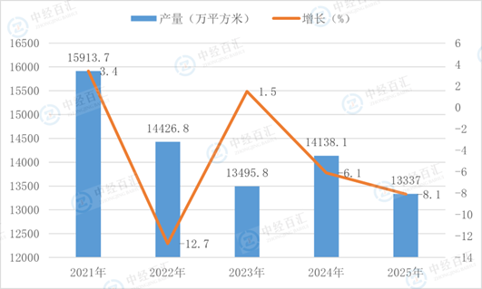 图表:2021-2025年中国中空玻璃产量及增长
