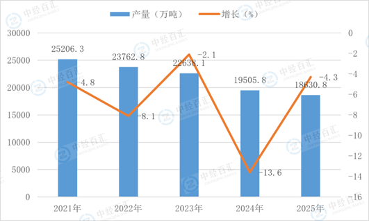 根据国家统计局数据显示,2025年,钢筋产量18630.8万吨,同比增长-4.3%。