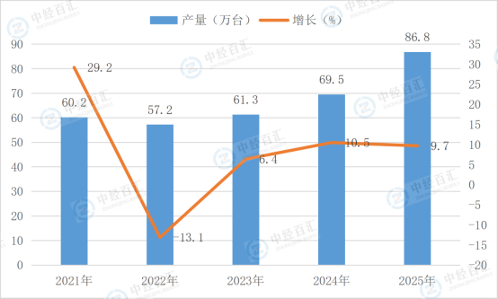 根据国家统计局数据显示,2025年,金属切削机床产量86.8万台,同比增长9.7%。