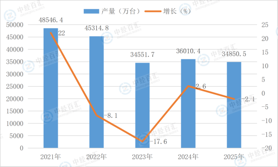 根据国家统计局数据显示,2025年,电子计算机整机产量34850.5万台,同比增长-2.1%。