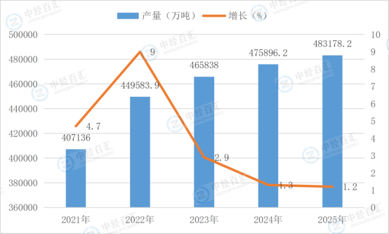 根据国家统计局数据显示,2025年,原煤产量483178.2万吨,同比增长1.2%。