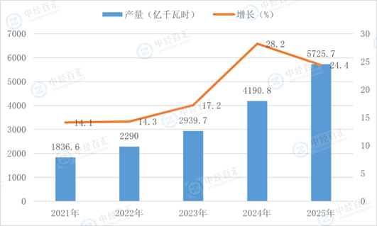 根据国家统计局数据显示,2025年,太阳能发电量5725.7亿千瓦时,同比增长24.4%。