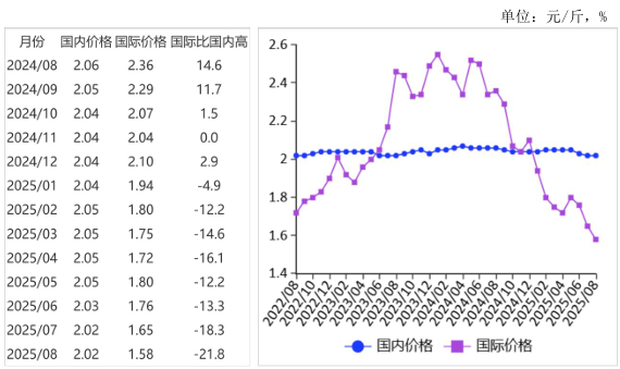 (四)国际大米到岸税后价低于国内,价差持续扩大。8月份,配额内1%关税下泰国大米到岸税后价每斤1.58元,比国内晚籼米批发价每斤低0.44元,价差比上月扩大0.07元;离岸价折人民币每斤1.3元,比国内低0.72元,低35.6%。