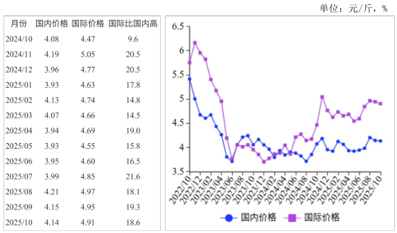 (二)国际油菜籽价格下跌,食用植物油价格涨跌分化。加拿大油菜籽产量和供应量明显高于上年,价格下跌。南美豆油库存量减少,阿根廷、巴西豆油出口量高于常年同期,价格小幅上涨。随气温下降,棕榈油消费量减少,而产量也明显减少,价格稳中微跌。10月份,加拿大油菜籽CNF价月均价(离岸价+运费)每吨508美元,环比跌2.3%,同比跌4.5%;南美豆油CNF价月均价每吨1162美元,环比涨1.0%,同比涨6.8%;马来西亚24度棕榈油离岸CNF价月均价每吨1086美元,环比跌0.2%,同比涨0.3%。