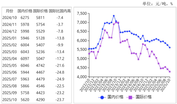 (一)国内糖价小幅下跌。新榨季初期,内蒙古、新疆甜菜糖厂陆续开榨,新糖集中上市,国外进口加工糖到港,食糖工业库存同比增长,市场供给充足;随着天气转凉,食糖进入传统消费淡季,下游商户随用随采,国内糖价小幅下跌。10月份,国内食糖均价每吨5620元,环比跌2.4%,同比跌10.4%。