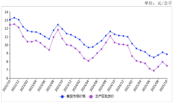 图表:2022-2025年10月鸡蛋价格小幅下跌