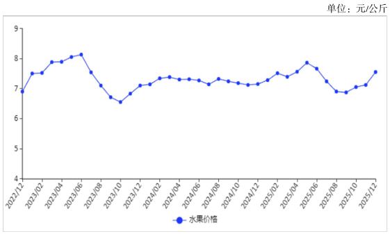 (一)水果价格环比连续3个月上涨。12月份水果供给以柑橘、苹果、梨、香蕉等为主,辅以设施草莓、进口车厘子等高价值水果,总量充足,受节假日消费拉动,价格环比小幅上涨。12月份,农业农村部重点监测的6种水果批发均价每公斤7.56元,环比涨6.0%,同比涨5.6%。其中,西瓜、香蕉、巨峰葡萄、菠萝环比分别涨27.3%、涨9.5%、涨5.8%、涨1.3%、涨0.4%;富士苹果环比基本持平。香蕉、鸭梨、巨峰葡萄同比分别跌11.0%、跌8.9%、跌0.7%;西瓜、菠萝、富士苹果同比分别涨42.4%、涨11.8%、涨11.3%。分品种看,西瓜、葡萄供应持续减少,价格上涨。苹果受库存成本支撑及年底节假日消费需求拉动,价格止跌回升。江西、湖南、湖北等地脐橙、蜜橘集中上市,叠加沃柑、柚子等品类丰富柑橘供应,带动价格下跌,批发均价每公斤7.99元,环比跌4.45%,同比涨9.48%。辽宁丹东、山东济南等地设施草莓上市量持续加大,价格涨幅收窄,批发均价每公斤31.95元,环比涨5.6%,同比跌2.2%。2025产季猕猴桃主产区陕西陆续遭遇倒春寒、干旱、高温,预计减产明显,带动价格上涨,据北京新发地价格数据,12月30日翠香和徐香猕猴桃批发均价分别为每公斤13.5元和11元,同比分别涨8%和涨57.1%。