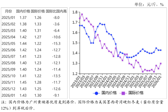 (四)国内外价差缩小。1月份,美国墨西哥湾硬红冬麦(蛋白质含量12%)离岸价直接折人民币每斤0.89元,比优质麦产区批发价低0.54元;配额内1%关税下到岸税后价约每斤1.3元,比国内优质麦销区价低0.13元,价差比上月缩小0.05元。