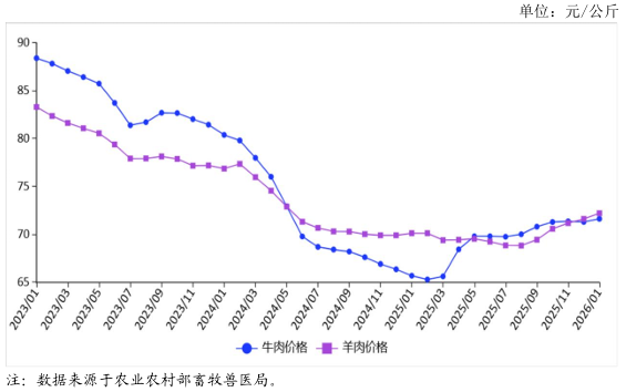 (三)预计近期牛羊肉价格稳中略涨。从供给端看,牛羊屠宰企业开工率在春节前达到高峰,叠加前期进口库存逐步释放,国内牛羊生产总体稳定,市场供应充足。据国家统计局数据,2025年全国牛、羊分别出栏5133万头、30143万只,牛肉、羊肉产量分别为801万吨、496万吨,较上年分别增长2.8%、下降4.2%。从需求端看,春节节日效应显现,企业备货和终端消费有所增加,牛羊肉消费需求稳步增长。综合来看,牛羊肉供应充足,消费需求较旺,预计近期牛羊肉价格将稳中略涨。