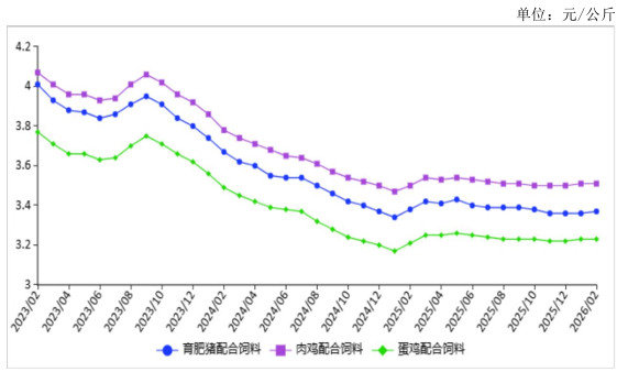(一)主要饲料产品价格以稳为主。春节期间饲料企业停工,养殖生产以消耗储备库存为主,饲料市场购销清淡,价格保持平稳。2月份育肥猪、肉鸡、蛋鸡配合饲料月均价分别为每公斤3.37元、3.51元、3.23元,环比分别涨0.3%、持平、持平,同比分别跌0.3%、涨0.3%、涨0.6%。从周数据来看,育肥猪、肉鸡、蛋鸡配合饲料价格连续4周保持平稳,2月第3周主要饲料价格环比均持平。