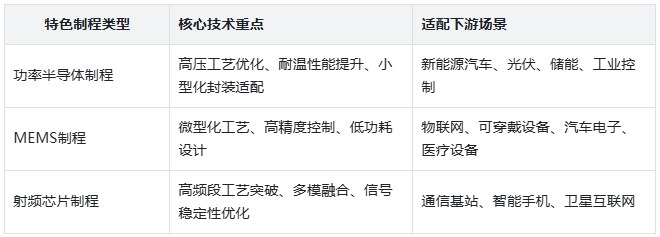不同特色制程的技术重点与应用场景各有侧重,适配不同下游领域的需求,具体如下表所示: