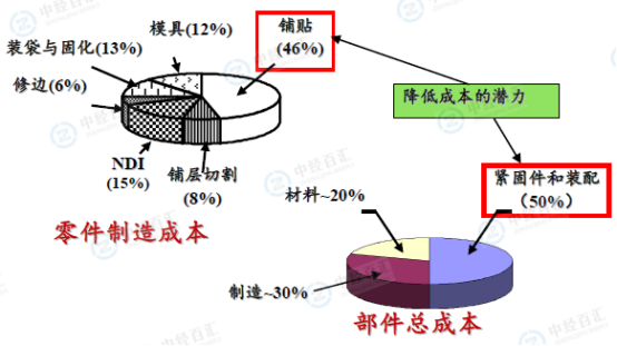 通过对碳纤维复合材料的成本结果分析,最大的成本空间是在复合材料结构件的设计和制造工艺上(如下图所示)。国外已在花大量的投入对这方面进行低成本的研究,而我国由于碳纤维企业产业链不完整,欠缺在这方面进行投入研究,所以造成应用成本居高不下,遏制客户需求,最终导致产业发展动力不足的窘境。