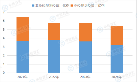 截至2024年12月31日,我国累计47家企业通过疫苗批签发,批签发总量为5.43亿剂,其中,免疫规划疫苗2.22亿剂,非免疫规划疫苗3.21亿剂。2024年批签发总量低于2023年的5.75亿支(瓶),同比减少3199.2万支(瓶),降幅5.6%,其中,免疫规划疫苗较2023年增加848.4万剂,增幅4%;非免疫规划疫苗减少4047.6万剂,降幅11.2%。