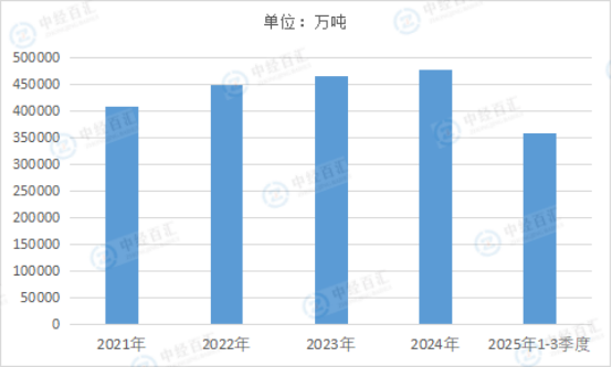 图表:2021-2025年1-3季度中国原煤表观消费量情况