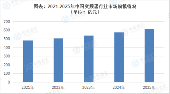 变频器是指应用变频技术与微电子技术,把电压与频率固定不变的交流电整流逆变为电压和频率可变的交流电,用于控制交流电机的转速、转矩的电力控制设备。变频器主要由整流(交流变直流)、滤波、逆变(直流变交流)、制动单元、驱动单元、检测单元微处理单元等组成,依靠内部IGBT的开断来调整输出电源的电压和频率,并根据不同电机的实际需要来提供其所需要的电源电压,以实现工业自动化控制系统的工艺调速和节能运行,提高生产效率和产品质量,降低生产能耗。变频器的应用领域广泛,可应用于风电、轨道交通、起重机械、纺织化纤、油气钻采、冶金、石油石化、电力等多个行业。随着国内工业生产规模不断扩大,我国变频器行业市场规模整体呈增长态势。2025年,中国变频器行业市场规模约615.3亿元。变频器市场规模受几大细分市场影响:低压下游成熟行业众多。下游化工、纺织等均为成熟行业,经过早期行业发展期后低压增速开始放缓,与中国经济增速和周期贴合程度高。中高压受益于新能源和节能等产业。下游应用端虽然有石化等行业,但电力对中压尤其是高压高效节能的需求增大,叠加新能源新增发电装机量增速较快,中高压年复合增速保持较快态势。