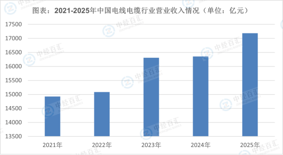 电线电缆,按国际有关规定其定义为“用以传输电(磁)能信息和实现电磁能转换的线材产品”。通常将结构简单无外护套、外径较小的产品称为电线,将结构复杂、有坚固密封外护套、外径较大的产品称为电缆。20世纪90年代以来,我国电线电缆业获得高速发展,中国也是仅次于美国的世界第二大电线电缆生产国。2011年,中国电线电缆产业规模首次超过美国,成为全球电线电缆行业第一大市场。随后,随着我国电线电缆市场快速发展,行业已经步入成熟阶段。近年来,随着中国电力、石油、化工、城市轨道交通、汽车以及造船等行业快速发展和规模的不断扩大,特别是电网改造加快、特高压工程相继投入建设,以及全球电线电缆产品向以中国为主的亚太地区转移,中国电线电缆行业市场规模迅速壮大,电线电缆制造业已经成为电工电器行业二十余个细分行业中规模最大的行业,占据四分之一的比重。2025年,电线电缆行业营业收入约17186.05亿元。