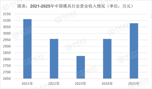 模具制造,指金属铸造用模具、矿物材料用模具、橡胶或塑料用模具及其他用途的模具的制造。模具行业被俗称为“工业之母”,从以单个车间生产为主到如今品牌林立,我国模具的质量和数量都有了非常大的飞跃。近年来,随着我国国民经济的迅速发展及人民收入水平的提高,消费市场对汽车、通信、电子、家电等消费品的需求快速提升,使得这些行业进入高速发展阶段,这也成为我国模具行业迅速发展的重要推动力。中国目前的模具行业交易市场发展非常迅猛。工业4.0的到来将中国的模具行业发展推向一个新高度。当前我国工业增加值逐渐上涨,也带着中国模具行业市场规模保持上涨,2025年,中国模具行业营业收入约3079.26亿元。