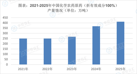 农药,是指用于预防、消灭或者控制危害农业、林业的病、虫、草和其他有害生物以及有目的地调节植物、昆虫生长的化学合成或者来源于生物、其他天然物质的一种物质或者几种物质的混合物及其制剂,包括预防、控制仓储以及加工场所的病、虫、鼠和其他有害生物;预防、控制危害河流堤坝、铁路、码头、机场、建筑物和其他场所的有害生物所使用的物质及其制剂。农药原药对研发能力、生产技术、生产工艺、环保和安全生产的要求较高,固定资产投资规模大,一般不能直接施用,其核心技术为农药有效成分化合物合成技术。2014-2020年,受到宏观经济、政策法规以及行业周期波动的影响,我国化学农药原药(折有效成分100%)产量出现下滑。近几年中国农药产量出现大幅下降是中国农药行业追求高质量发展的结果,也是全球需求下降自然调节的需要。随着农业农村部“到2020年实现化肥、农药使用量零增长”政策的实施,特别是高毒有机磷农药品种(其中绝大部分为杀虫剂)被逐步淘汰,农药总产量稳步下降。国家统计局数据显示,2025年,化学农药原药(折有效成分100%)产量411.7万吨,同比增长8.7 %。