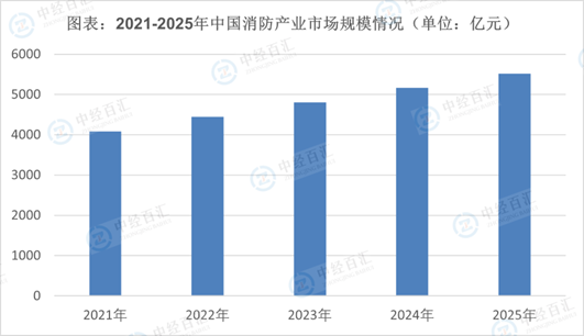 消防产业主要包括消防设备及产品的生产,消防工程设计、施工及消防技术服务。消防产业应用领域需求与国家经济周期的变化紧密相关,很大程度上依赖于国民经济运行状况及社会固定资产投资规模,特别是城市化进程和基础设施投资规模等因素。近年来,国民消防意识的逐步增强、消防法规的逐步完善、消防标准的不断提高,对消防产品行业的发展产生了强力的拉动效应。从产业周期来看,消防产业正处于成长期,需求与市场规模快速增长,竞争者数量不断增多,“大行业,小企业”是行业发展阶段所决定的。随着行业逐渐成熟,业内竞争将逐步加剧,行业集中度也得到提升。随着中国国民经济快递增长,消防产业也逐渐发展成型。但行业集中度低,全国真正有实力,能形成企业集团化、产品多元化的企业并不多,消防行业内的上市公司更是屈指可数。在政策的不断推进下,我国消防行业市场规模不断增长。2025年,中国消防产业市场规模约5521亿元。