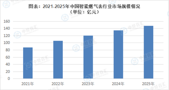 燃气表是燃气能源计量的主要计量器具,其质量优劣涉及供需双方利益,计量行政机构、制造单位、供气企业都非常重视燃气表的产品质量。燃气表的上游产业是钢、铝、塑料、电子元器件等,属于基础原材料和配件,由于上述原材料占生产成本比重较高,因此上述原材料及配件价格波动会对燃气表成本造成一定影响。燃气公司作为国内的主要燃气终端供应商,其自身的发展对本行业有较大的推动作用。未来国家将加大天然气的开采和利用以及调配工作,促进行业快速发展。智能燃气表作为重要的常用能源计量仪表,一直是保持中国国计民生稳定发展的重要基础。近年来,国家出台了相关政策,一方面加强市场中已有智能燃气表的质量检测,排查安全隐患,另一方面引导原有的机械燃气表行业向智能化、物联化方向发展。随着中国城市化进程的加快、“煤改气”工程的持续推进等因素的加持,中国智能燃气表行业的需求量业不断增多。从市场规模角度来看,在我国城市化进程的加持下,国内智能燃气表行业的市场规模连年增加,2025年智能燃气表行业市场规模约147.56亿元。