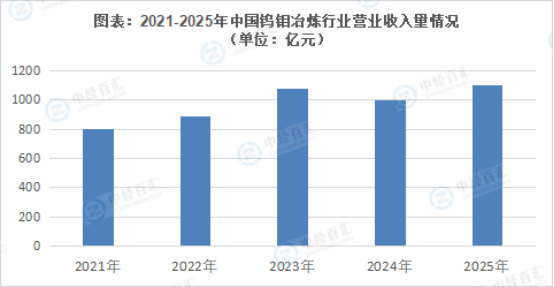 钨钼冶炼是依托钨、钼两种高熔点稀有金属矿物资源,通过一系列物理化学工艺实现从原矿到高纯金属及合金产品的转化过程,是钨钼产业链的核心中游环节。其核心逻辑在于破除矿物中钨、钼与其他元素的化学键合状态,经富集、分离、提纯后获得符合工业要求的原料或成品。2025年,中国钨钼冶炼行业营业收入约1103.48亿元。下游高端制造领域的蓬勃发展形成了强劲的需求支撑,航空航天、半导体制造、光伏产业等关键领域对钨钼高端材料的需求持续攀升,带动了高纯钨粉、钼靶材、钨丝等高附加值产品的产销增长。政策层面的积极引导为行业发展保驾护航,双碳目标下国家对战略性矿产资源的保护与合理开发规划清晰,鼓励类冶炼工艺政策及技改补贴推动产能向集约化、绿色化转型,落后产能的逐步出清进一步提升了行业整体运营效率与优质产能占比。技术创新的持续突破为增长注入核心动力,绿色冶炼、智能生产等技术的推广应用降低了加工损耗与单位能耗,资源综合利用水平不断提升,同时头部企业的产业链整合与全球化布局优化了资源供给与市场布局,增强了行业的盈利能力与抗风险能力。