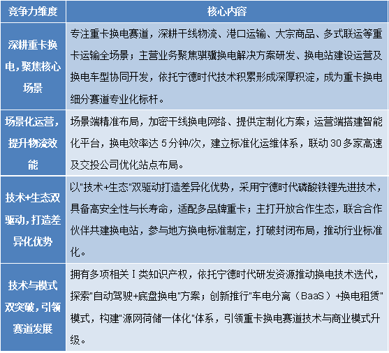 整体来看,中国换电市场集中度较高,两大细分赛道均呈现头部企业领跑的格局,而时代电服与时代骐骥作为宁德时代体系下的两大核心主体,分别在乘用车、重卡换电赛道占据头部地位,凭借17.06%、15.37%的细分市场占有率,成为市场化主体的标杆。两者凭借灵活的运营模式、持续的技术创新和开放的合作生态,在各自细分赛道实现快速突围,市场影响力持续提升,不仅为宁德时代构建了全场景换电生态,更成为推动换电行业标准化、规模化、市场化发展的重要力量。