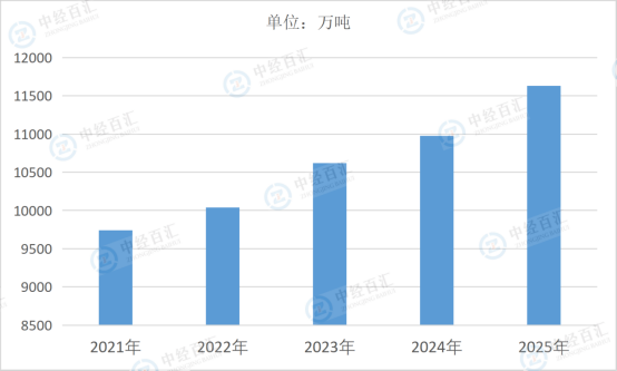 图表:2021-2025年中国甲醇产量情况
